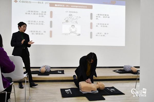 此外,谢医生还给我们介绍了海姆利克急救法,对于不同的人群,操作的手法也不尽相同,医护人员详细的给我们演示了青年、孕妇以及婴儿的海姆利克应对方法。之后,在座的教职工们在医护人员的指导下进行了心肺复苏的实践训练,更加深入的理解整个过程。