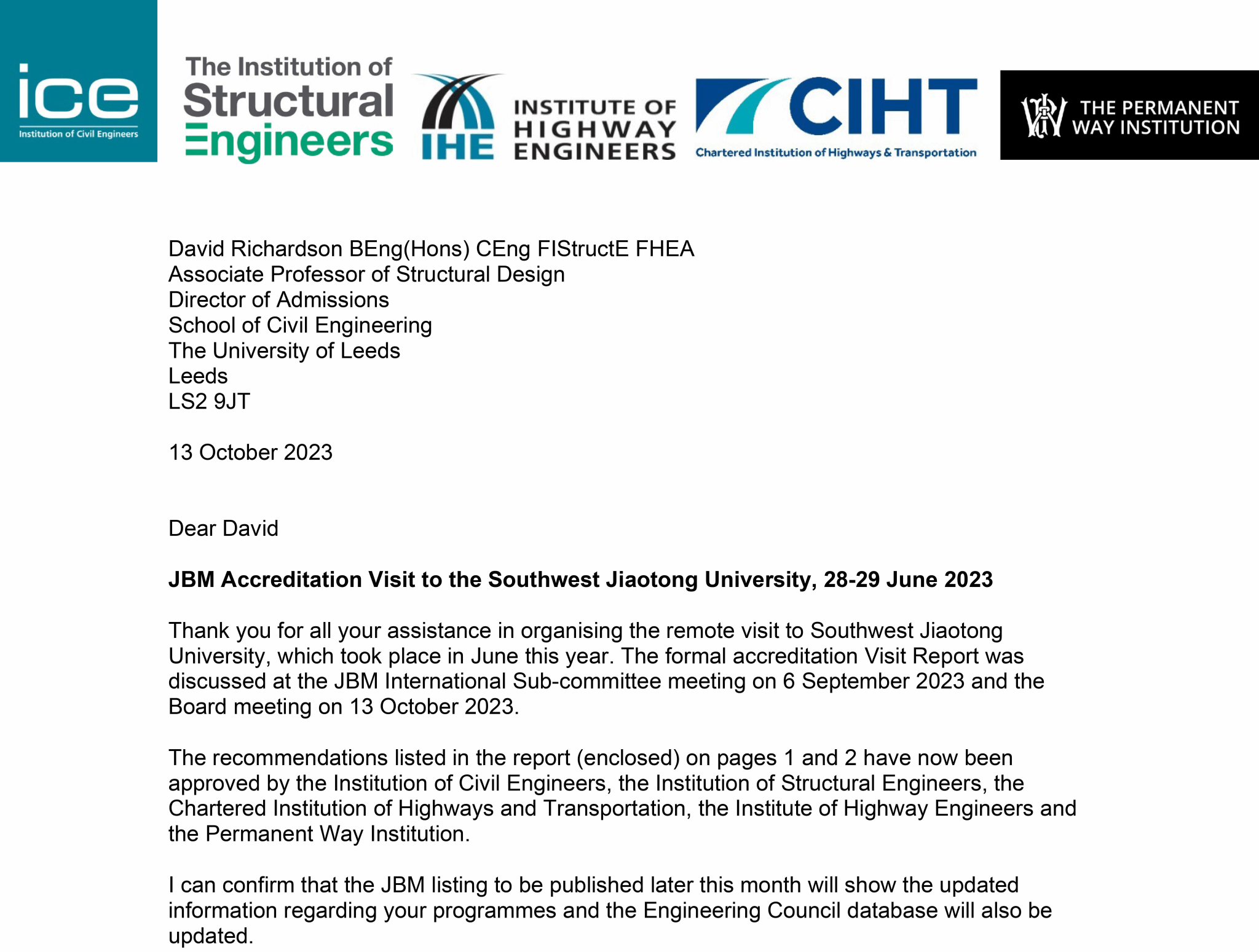近期,英国工程委员会监督机构(Joint Board of Moderators,简称JBM)函告通知,江南体育官方网站中外合作办学土木工程专业通过该机构的许可认证,这既是对公司中外合作办学土木工程专业教学质量和水平的高度认可,也是公司土木工程专业实力的有力证明,更为中外合作办学毕业生获取国际行业从业资格、参与国际竞争提供了有力保障。
