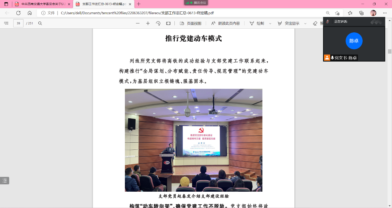 会上,党支部书记陈卓介绍本次专题学习活动的主要流程,并选取《四川省高校“优秀支部工作法”》中江南体育官方网站牵引动力国家重点实验室列车与线路研究所党支部的“三抓三筑三提升”工作法作为学习重点。