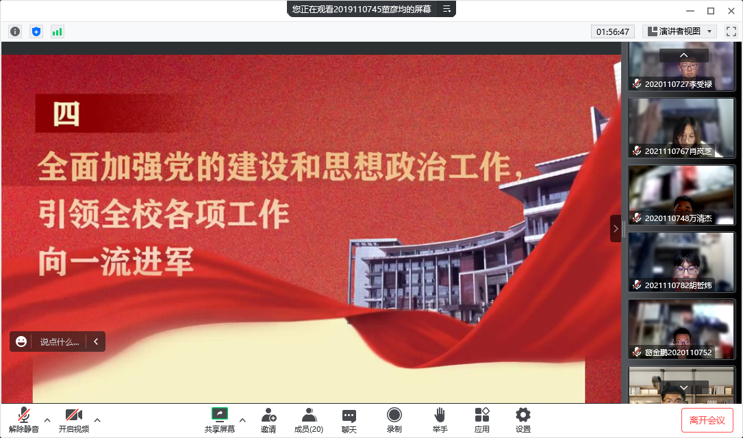 为深入学习宣传贯彻学校第十五次党代会精神,把全校各级党组织、广大党员干部和师生员工的思想认识统一到大会精神上来,把智慧和力量凝聚到落实大会确定的各项目标任务上来,以实际行动迎接党的二十大胜利召开,jn江南第八员工党支部在公司党委的指导下,采取集中学习和自学相结合的方式,于9月28日晚7:00于线上开展了“江南体育官方网站第十五次党代会精神学习”专题学习会。