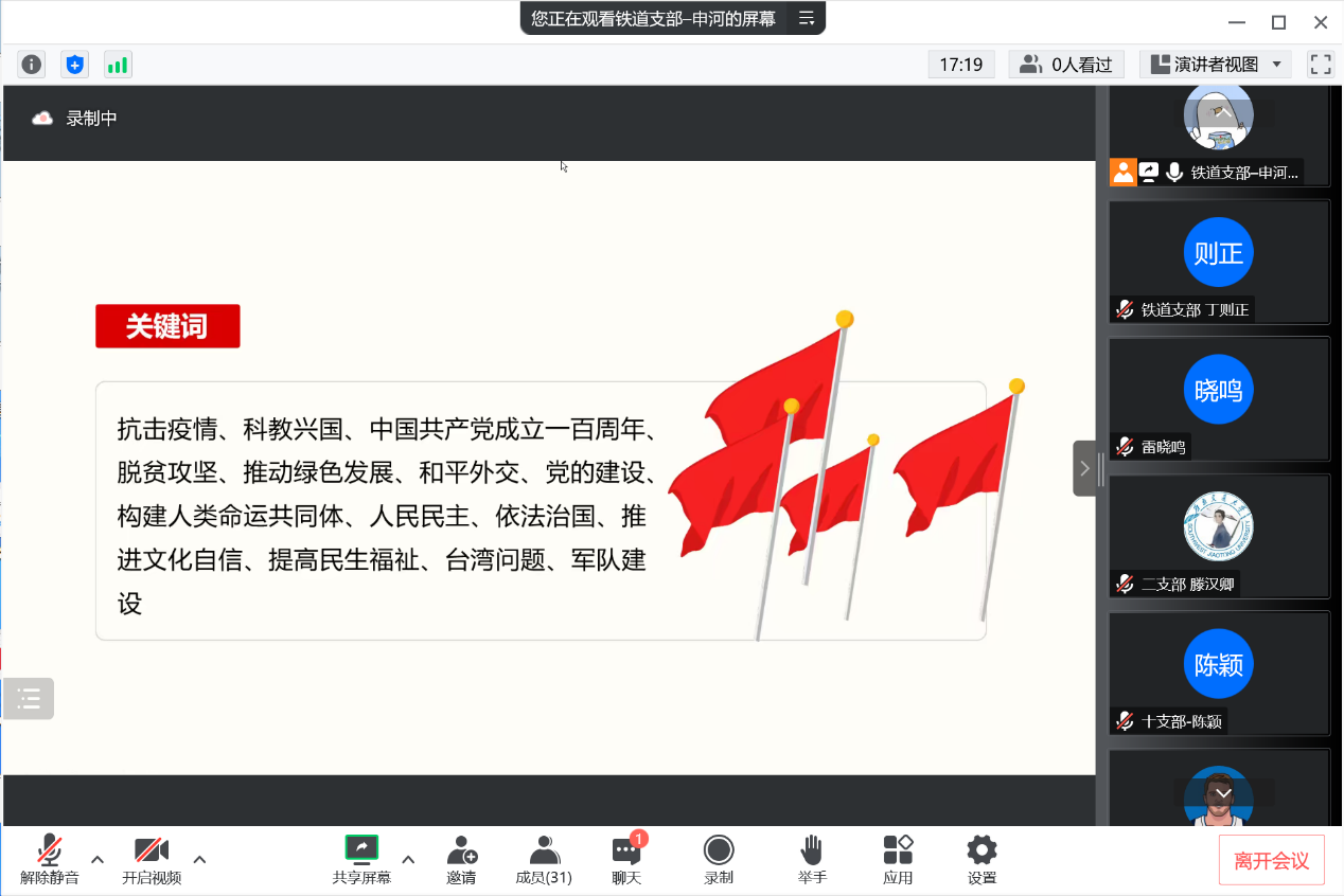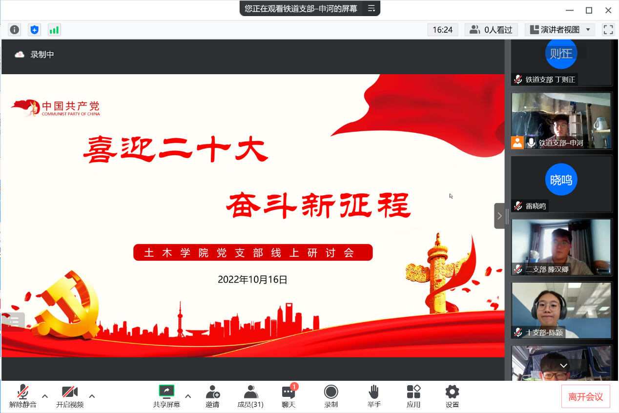 为深入学习贯彻习近平新时代中国特色社会主义思想,第一时间学习领悟中国共产党第二十次全国代表大会精神,10月16日下午4时,由土木员工铁道党支部主持,jn江南本科各员工党支部参与的党的二十大精神研讨会以线上会议的形式举行。出席本次研讨会的有支部指导老师雷晓鸣同志和各支部支委代表。
