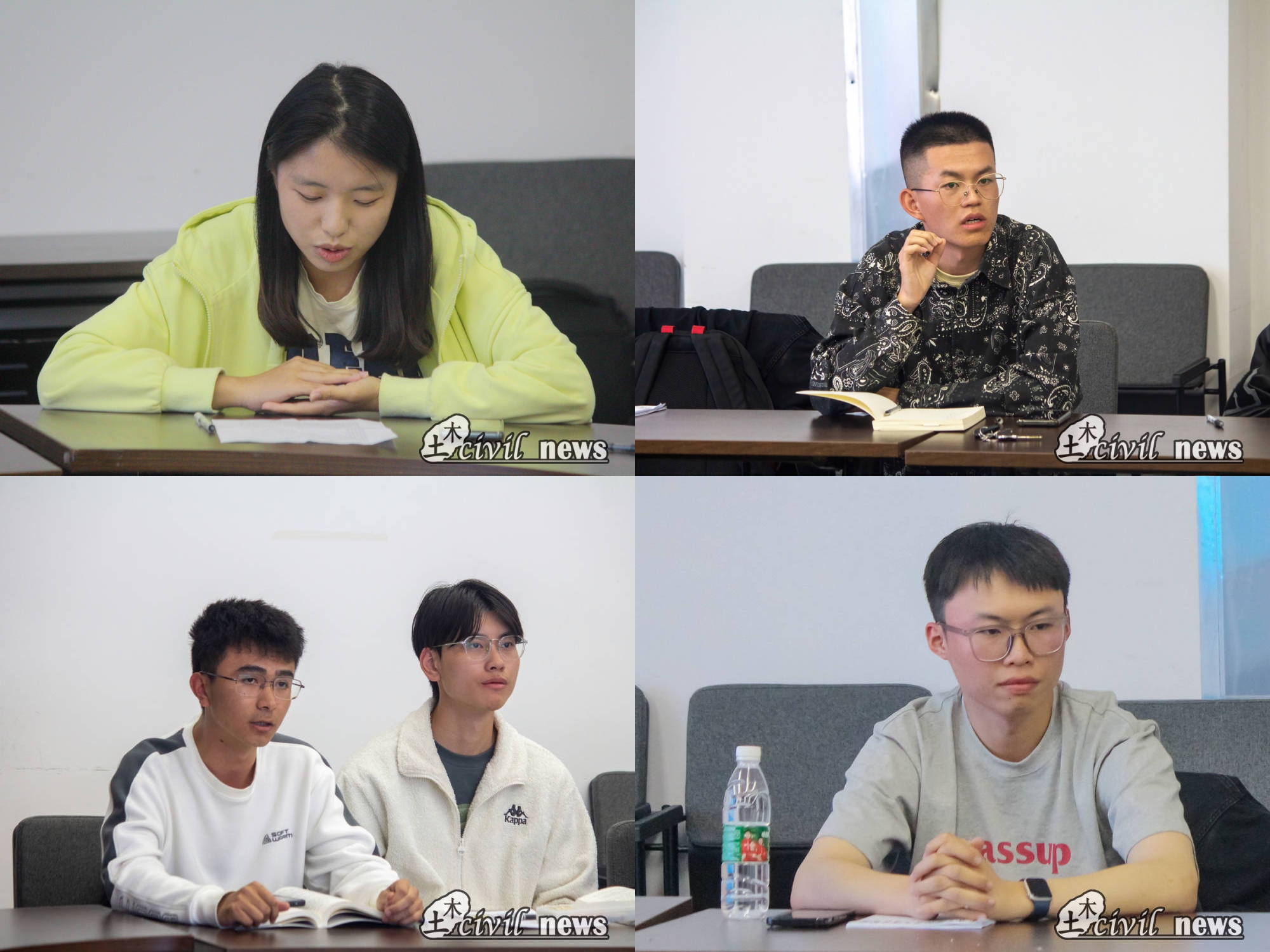 员工会主席团成员陶祚诏则分享了个人大学期间的成长经历,指出应善于端正学习态度、树立短期目标并为之不懈努力。ASCEISG主任吴津庭鼓励同学们在不断提高个人能力的过程中积极投入社会实践,在创新实践中实现个人价值。新闻中心主任叶晨希通过分享文学阅读带来的现实思考鼓励同学们提升个人审美素养,在专业学习过程中争做“德智体美劳”综合发展的新时代土木青年。