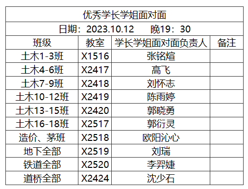 为搭建朋辈交流平台,进一步学习先进典型人物标杆,提高学院学风建设水平。土木学院老员工学业与发展指导中心将于2023.10.12日晚19:30在新生年级范围内开展优秀学长学姐面对面活动。参与本次活动的学长学姐均为荣获2022年度十大优秀本科生荣誉称号的员工。学长学姐将通过围绕自身的学习经验、竞赛经验、员工工作经验以及科研经验开展本次面对面活动。希望2023级土木新生能够认真聆听并感悟优秀员工个人成长经验,构建属于自己的美好并且丰富的老员工活。活动教室以及分配班级如下所示: