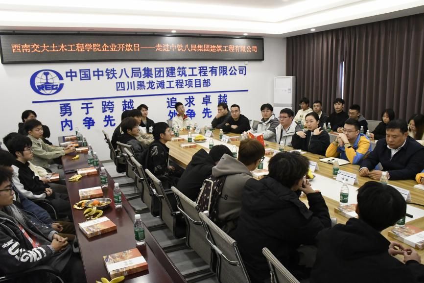 公司师生通过观看中铁八局建筑公司宣传片,了解了企业文化及工作氛围。中铁八局重庆东站项目实习副经理兼工程部部长、学院青年讲师团成员张浩、中铁八局建筑公司黑龙滩项目副总工程师凌麒依托重庆东站项目宣传片及黑龙滩项目宣传片,为学院师生讲解了项目建设情况及施工重难点。
