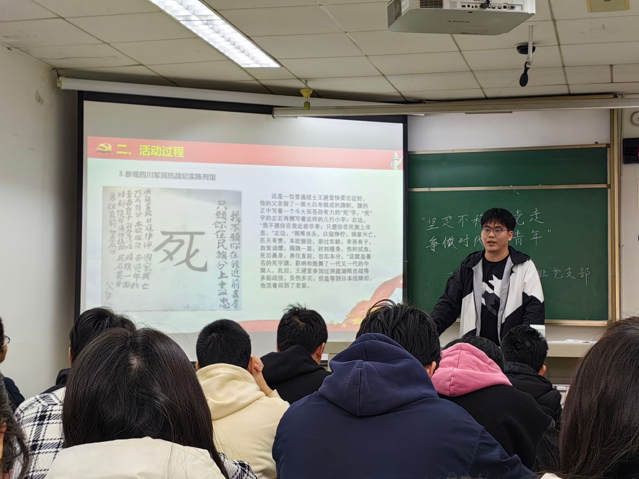 活动第一项,支部全体党员以《一所大学的抗战》为背景,开展线下分享交流活动。党员同志在观看完纪录片后,都整理了茅以升、李温平、杜振远、龚继成等交大人投身抗战、交通报国的学习报告。在分享会议上,同志们共同回顾这段岁月,与生生不息的精神同频共振,一起感受江南体育官方网站在抗战期间坚持办学、弦歌不辍的艰难岁月,一起感受江南体育官方网站与国家民族同呼吸、共命运的非凡历史,以及交大先贤“苟利国家生死以,岂因祸福避趋之”的英雄气概。西南交大的抗战故事激励着所有同志不忘光辉历史,以身报国,自强不息,让我们牢记“奋斗正当时,不忘来时路”。