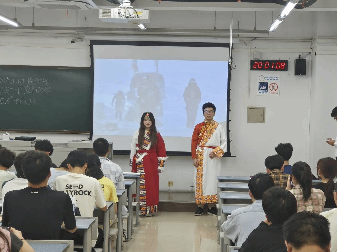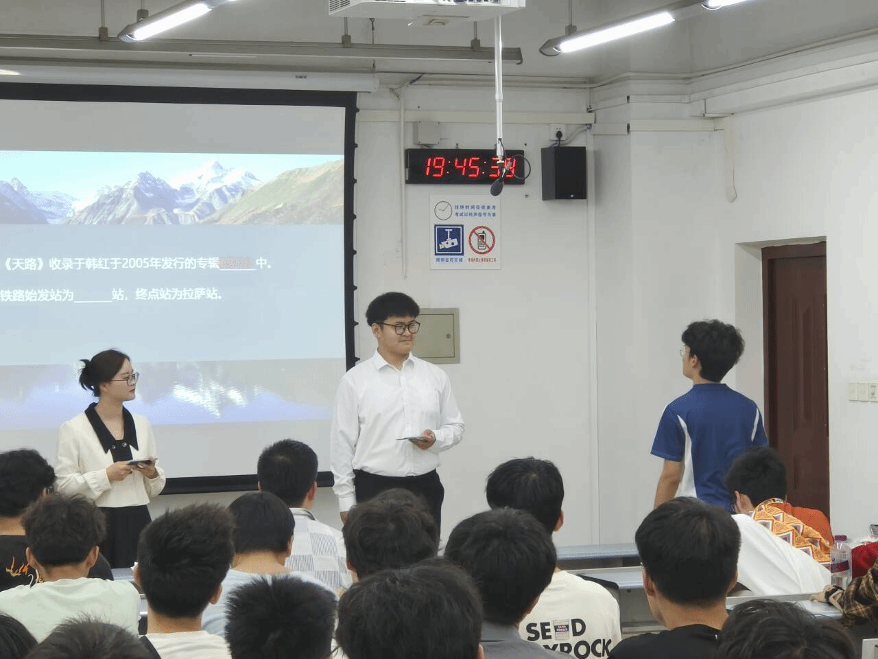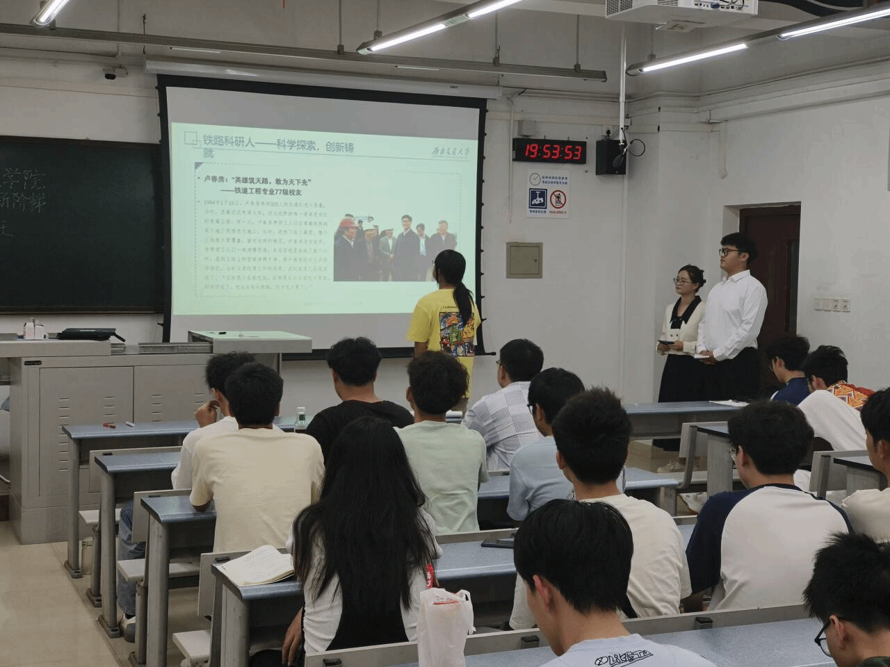 课程主要由四个环节组成,分别是:青藏铁路的情况介绍、老员工艺术团成员领唱并合唱歌曲《天路》、科研前辈的探索路程分享、观看视频。首先,通过观看青藏铁路介绍视频,同学们对青藏铁路有了基本的认识,然后主持人以提问同学们有关青藏铁路相关知识的方式开启了今天的讲演分享。接着,主持人邀请了同学们上台朗读四位科研前辈的故事,让同学们更深刻的了解了有关青藏铁路建造的困难艰险以及前辈们为了建造青藏铁路做出的杰出贡献,学习到了铁路工作者身上的高贵品格与踏实刻苦的精神。