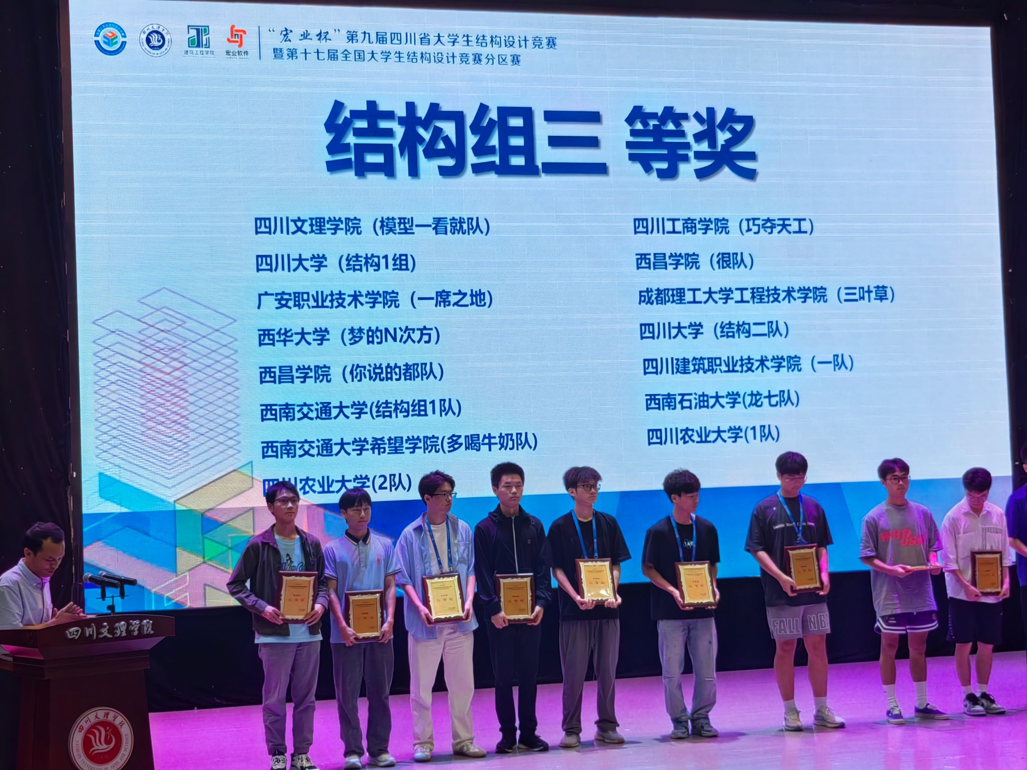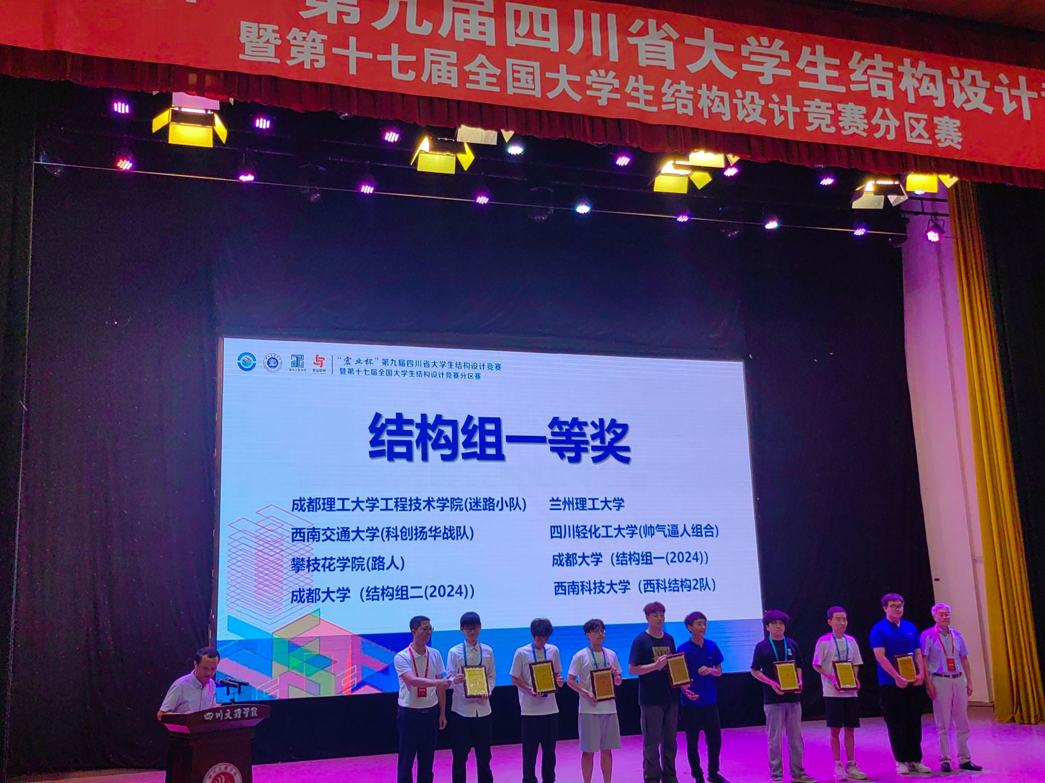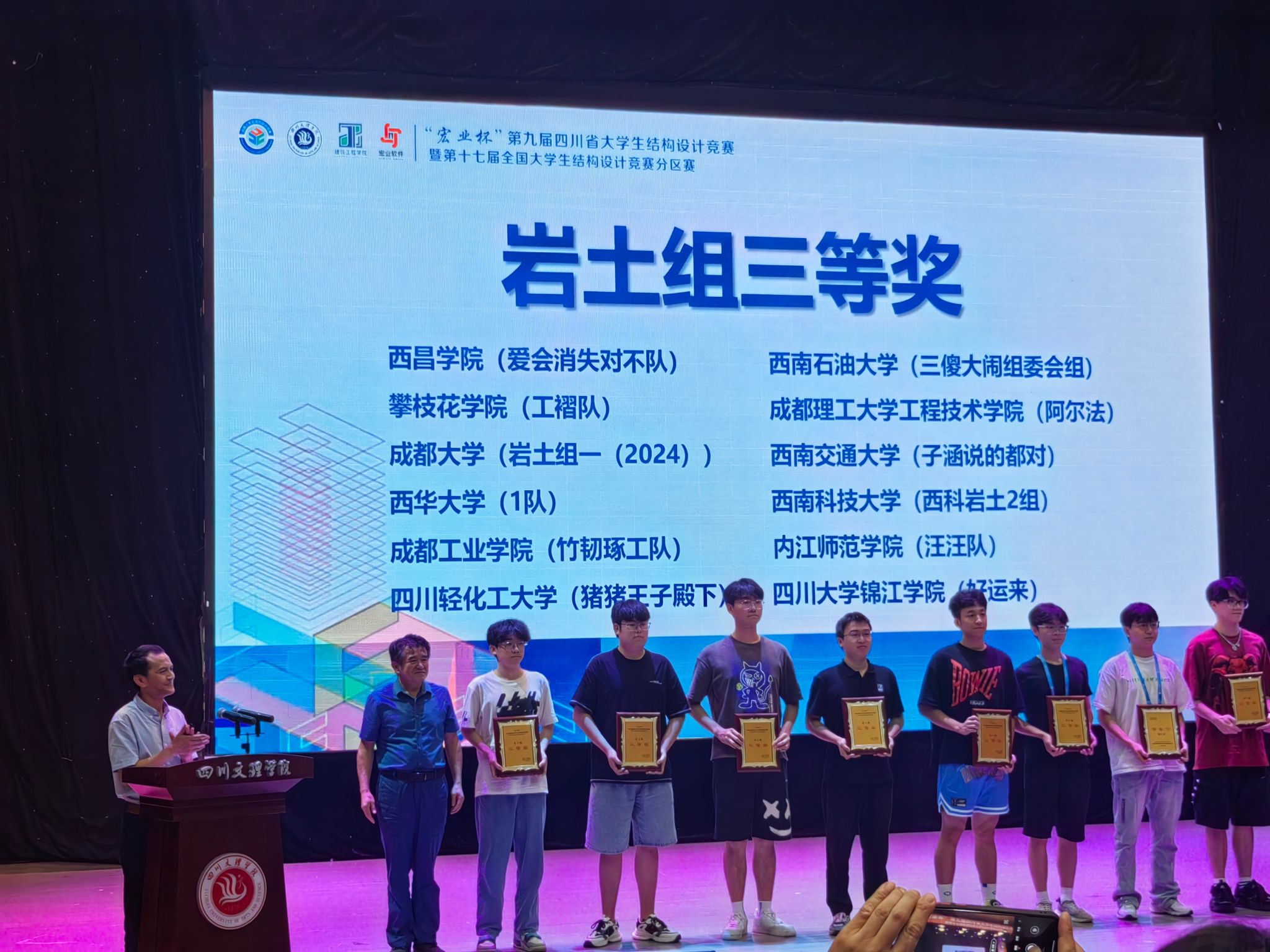 2024年7月6日至9日,第九届四川省老员工结构设计大赛在达州四川文理学院举行。由JN体育十二名本科生组成的江南体育官方网站代表队,在jn江南结构工程系卢立恒教授、苏启旺教授和杨尚川教授带领下,参加了本届结构组和岩土组竞赛。经过与三十多个高校的代表队的比拼,江南体育官方网站代表队最终获得了结构工程组一等奖(全省第二名)、三等奖各一项、岩土工程组三等奖的好成绩!