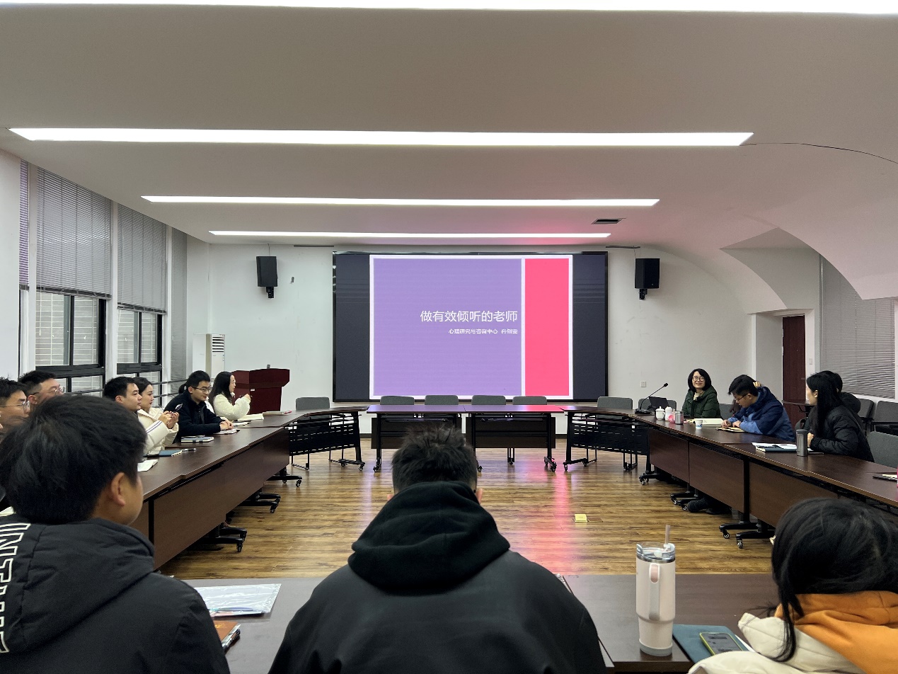 12月18日上午,学院学工组在X4407开展本学期心理技能培训。活动邀请到心理研究与咨询中心冉俐雯老师主讲“做有效倾听的老师”专题,学院学工组集体参与学习。活动由公司党委副书记刘萍主持。