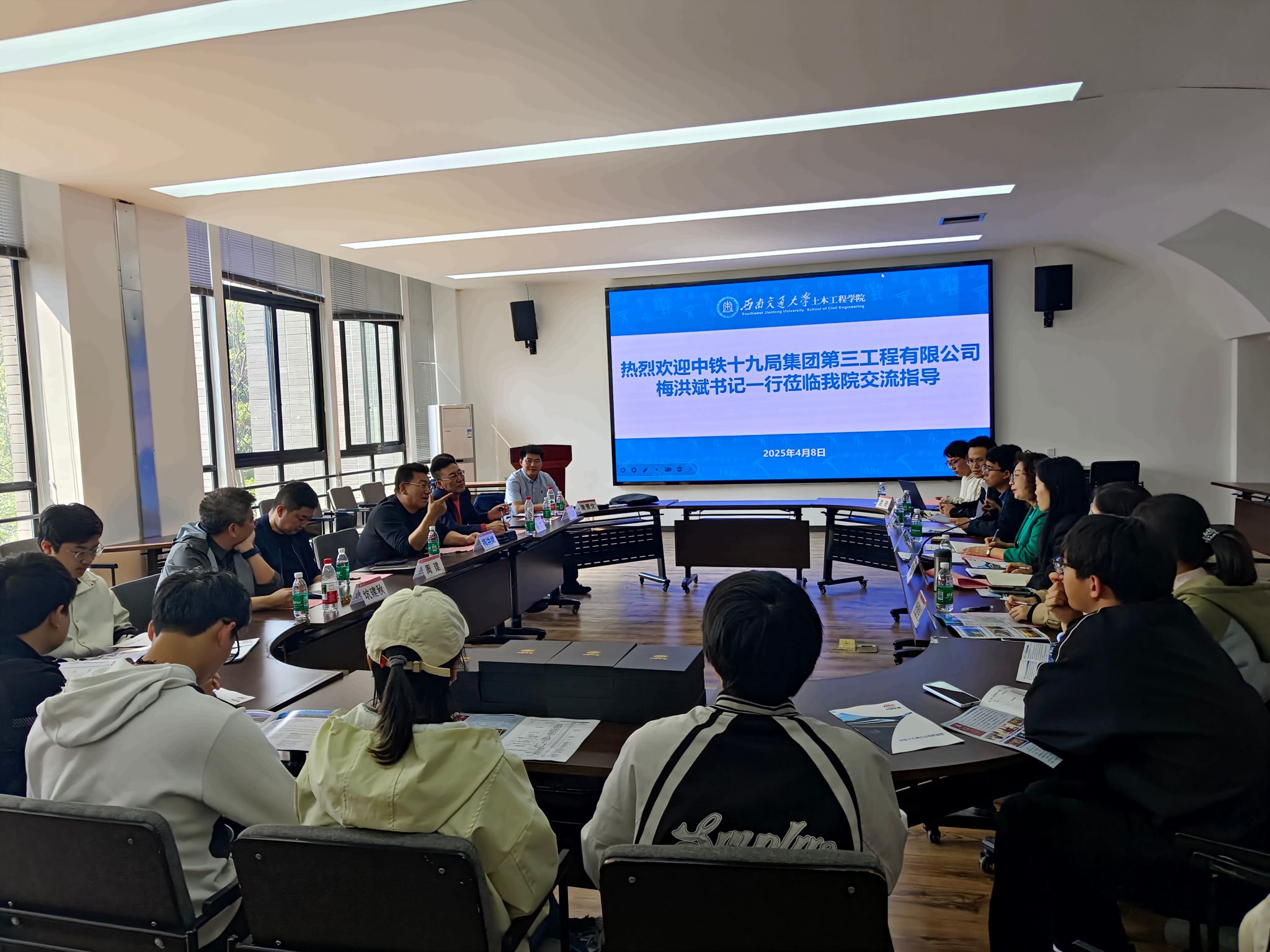 2025年4月8日上午10:30,中铁十九局三公司董事长梅洪斌、纪委书记陈广、第八项管部经理周建、第十项管部经理刘韫鑫、第十一项管部经理坑建秋、党委干部部部长唐景文一行走访JN体育,并于犀浦校区X4407会议室开展校企合作座谈交流,土木工程公司党委书记郑江、党委副书记刘萍、本科生就业专项负责人李江怀、2025届本科生辅导员杨颖钊、彭政涛、2026届本科生辅导员孟迪及15名员工参与此次座谈。