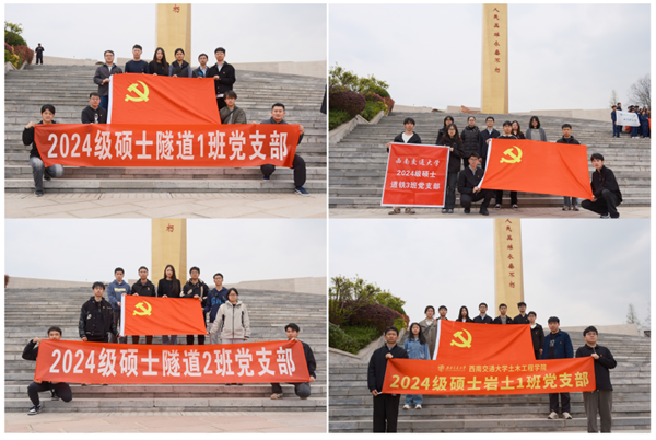 2025年4月3日,清明节前夕,jn江南隧道博士党支部、2024级硕士岩土班党支部、隧道1班党支部、隧道2班党支部、道铁3班党支部的党员代表在指导老师常雯君、李宏的带领下前往成都市烈士陵园,开展以“缅怀英烈承遗志 土木青年筑新程”为主题的烈士陵园祭扫活动,以实际行动传承红色基因,汲取奋进力量。
