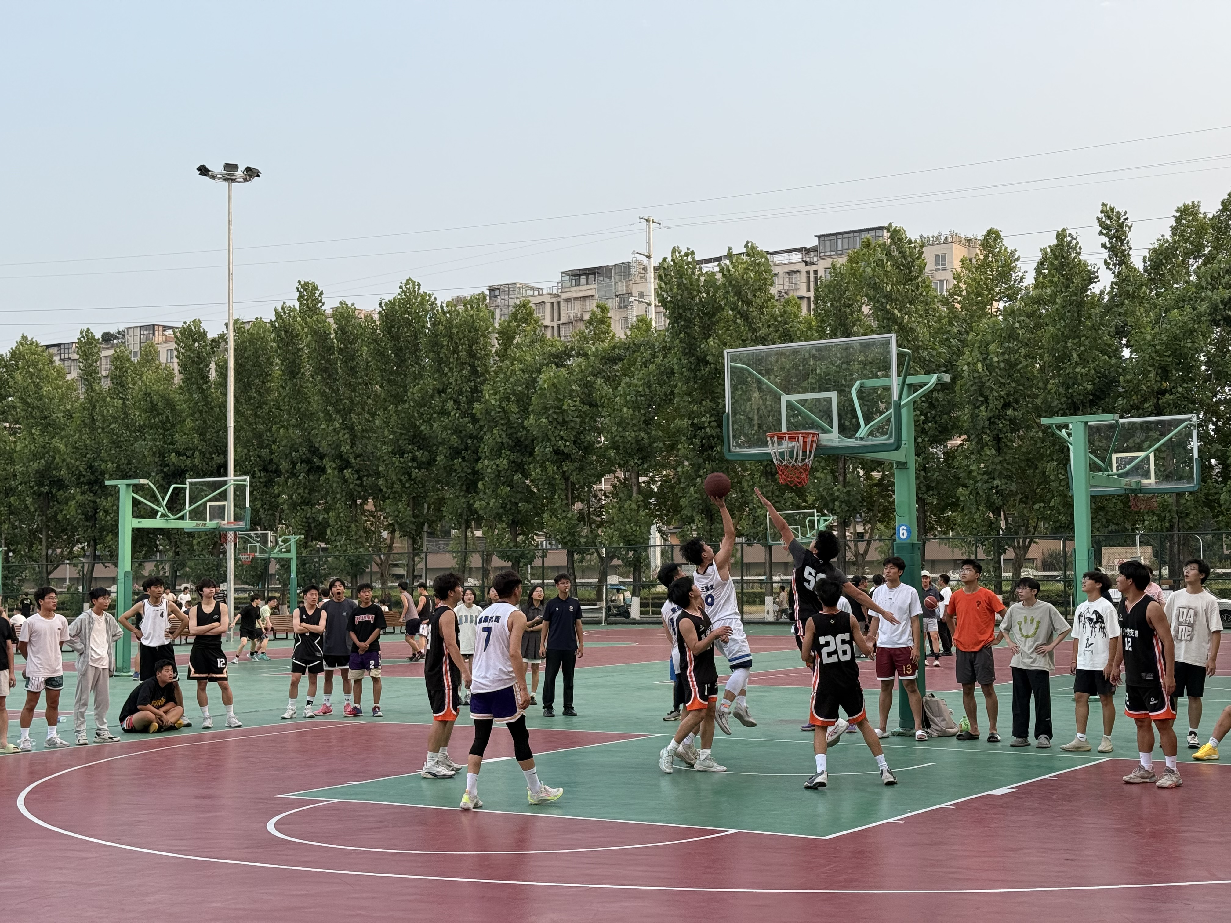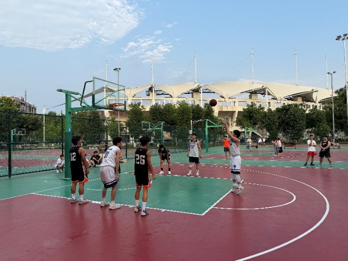 上半场第二节比赛,双方你来我往,攻防节奏愈发激烈,快攻上篮、篮下强打、干拔跳投等精彩场面层出不穷。第三节双方易边再战,第八党支部调整战术,充分发挥28号与9号球员的个人能力,通过挡拆配合连续得分,在第三节结束时将分差缩小至5分,比赛悬念丛生。