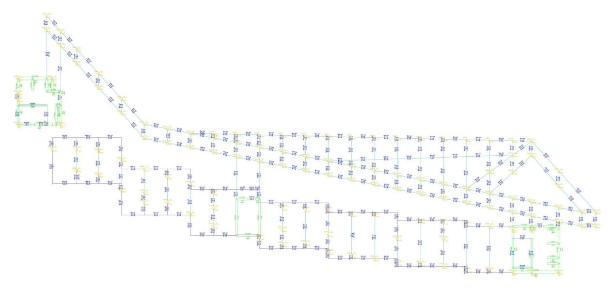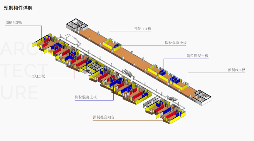 对于建筑主体部分,采用框架结构,在左、中、右三个局部,布置剪力墙。以此满足建筑主体错动悬挑大的特点。对于建筑附属连廊部分,在退台区域,采用单排柱以及与主体部分用梁连接。以此满足连廊的形态。并对其进行预制构件设定,完成装配式拆分设计。完成初步施工图设计。