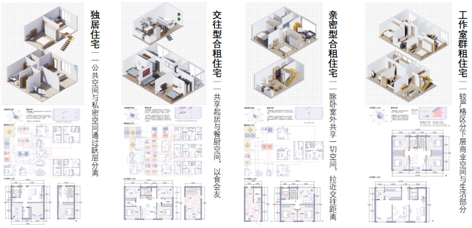 在进行住宅设计时,参赛队员们采取了模块化设计的方法,首先以3.9m*8.2m 单元为一个模块,高度为2.8m,其面积为 31.98m2,用模块水平、垂直方向叠加的手法,得到从两个模块至四个模块种类中不同的主要 7 个户型形态,再根据居住人群的划分,制定不同的户型方案。