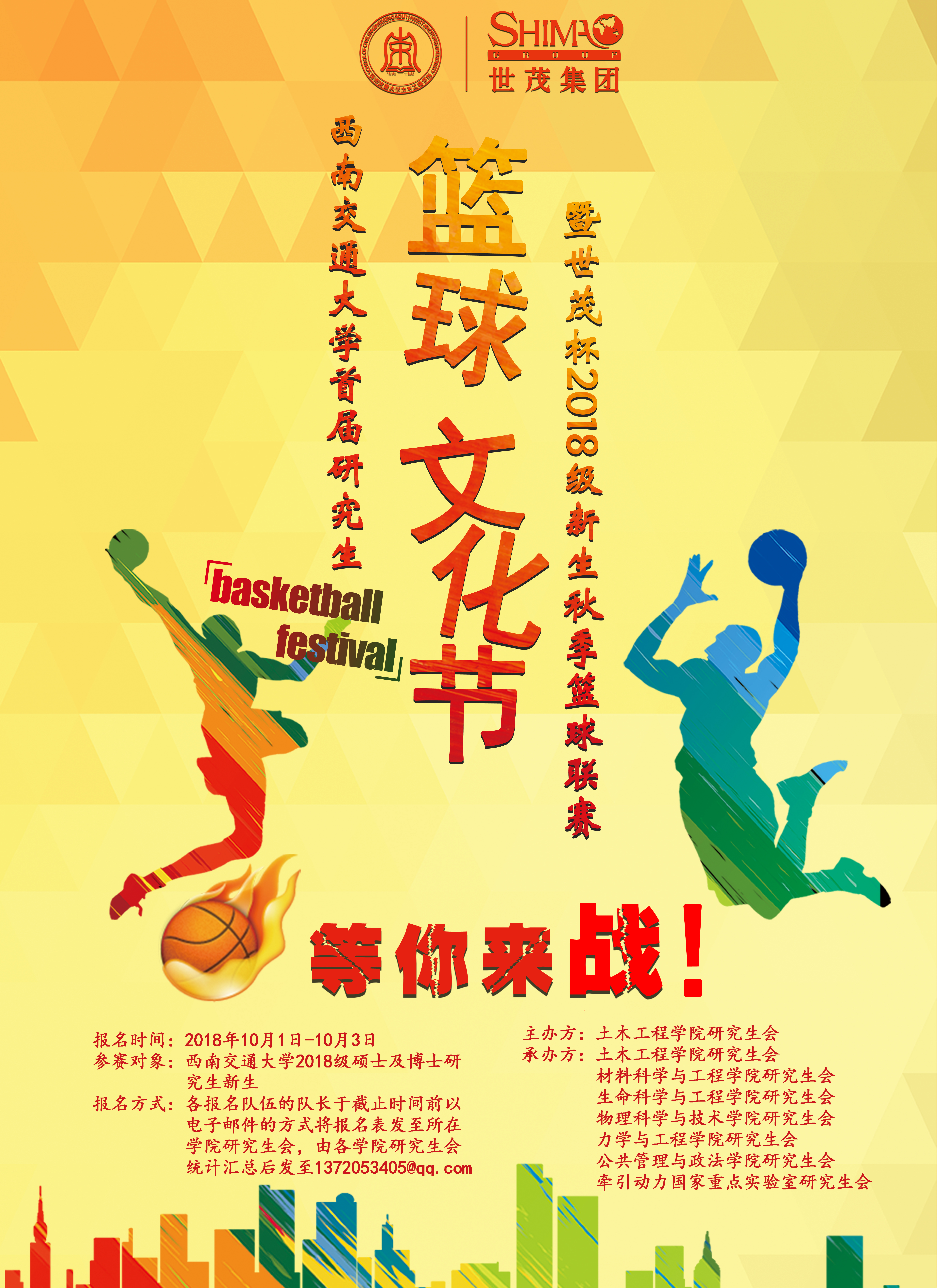 为了活跃师生文化生活,促进师生身心健康,增进各学院、各班级间的交流与友谊,根据各学院研究生会商议,定于10月份举办江南体育官方网站(九里)首届研究生篮球文化节暨“世茂”杯2018级新生秋季篮球联赛。为使比赛顺利举行,请各学院、班级按照以下内容组织报名。