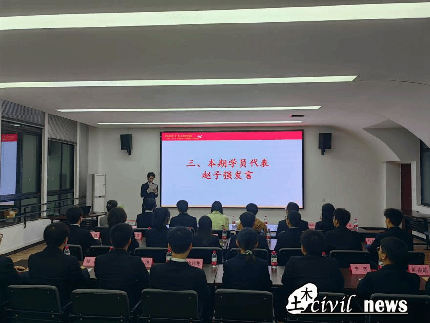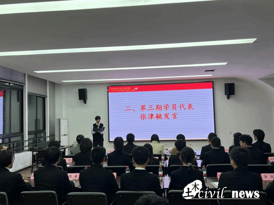 随后,“红志”班第四期学员代表赵子强同学上台发言。赵子强提到,习近平总书记强调:青年兴则国家兴,青年强则国家强。广大青年是新时代中华民族复兴事业的建设者和奋斗者,实现中华民族伟大梦想的主力军。因此,同学们更应该提高自身思想素质,理论水平及工作能力,练就过硬本领,担当责任使命。他表示作为“红志”班的一员,同学们应当勇担推进新时代中国特色社会主义事业的青年使命,为JN体育全体学子树立模范榜样,为努力建设土木学院更加美好的明天贡献属于自己的一份力量。