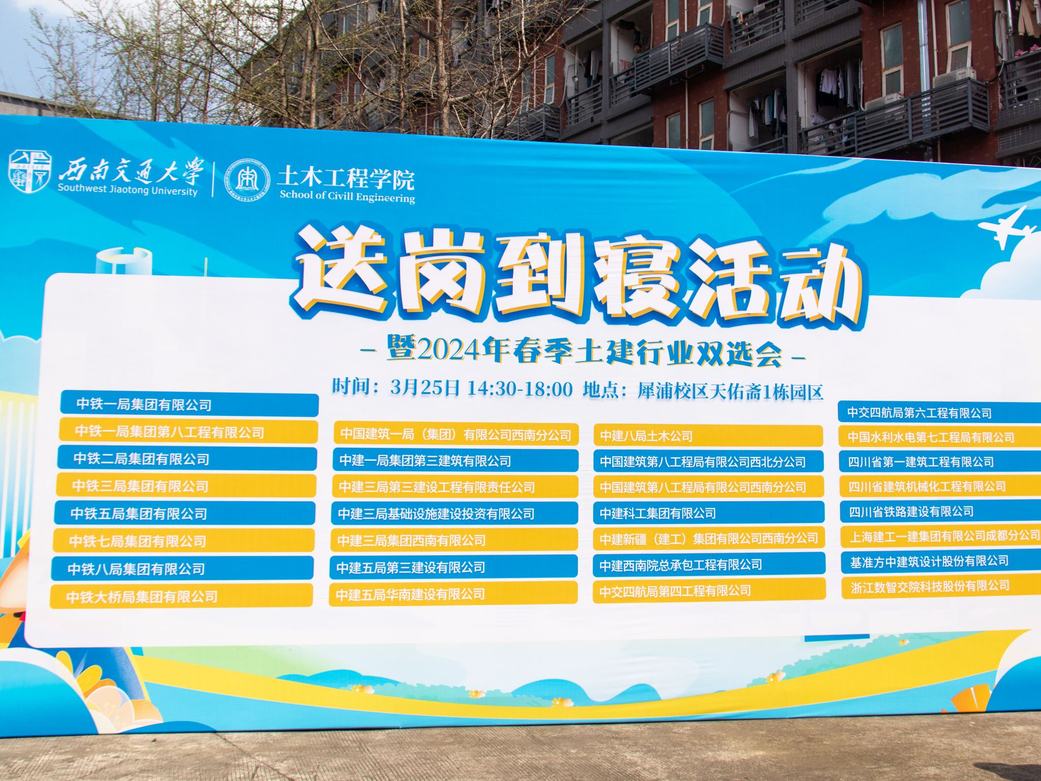 为深入贯彻落实党的二十大精神,落实党中央、国务院“稳就业”“保就业”决策部署,促进毕业生更高质量更加充分就业,jn江南于2024年3月25日下午在犀浦校区天佑斋1栋员工宿舍园区成功举办了一场别开生面的“送岗到寝”活动暨2024年春季土建行业双选会。