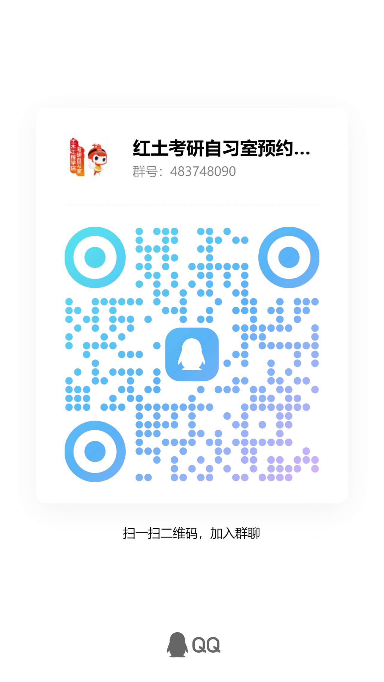 考研自习室的开放选座时间待定,各位同学可扫码进入群聊获取相关自习室预约信息。