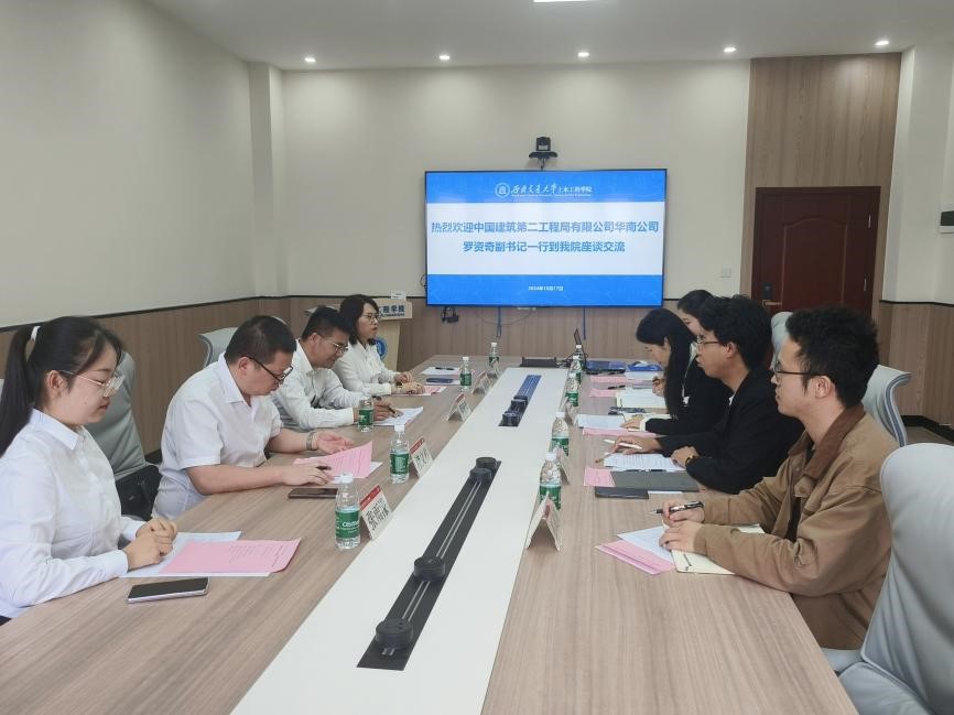 2024年10月18日下午16:00,中建二局华南公司党委副书记、工会主席罗资奇、华南公司人力资源部经理郭建伟、华南公司东莞分公司党总支副书记褚文科、华南公司东莞分公司综合办公室主任王龙、华南公司人力资源部招聘经理张雨濛一行走访JN体育,并于犀浦校区X4417B会议室开展校企合作座谈交流,土木工程公司党委副书记刘萍、辅导员李江怀、杨颖钊、彭政涛、孟迪参与此次座谈。本次会议由李江怀主持。