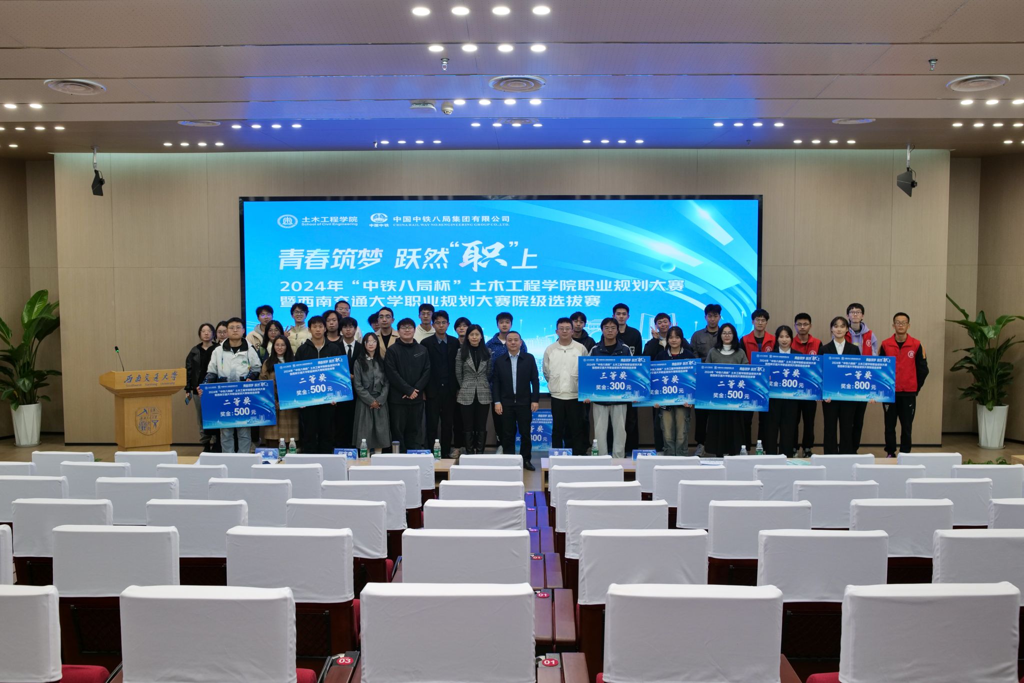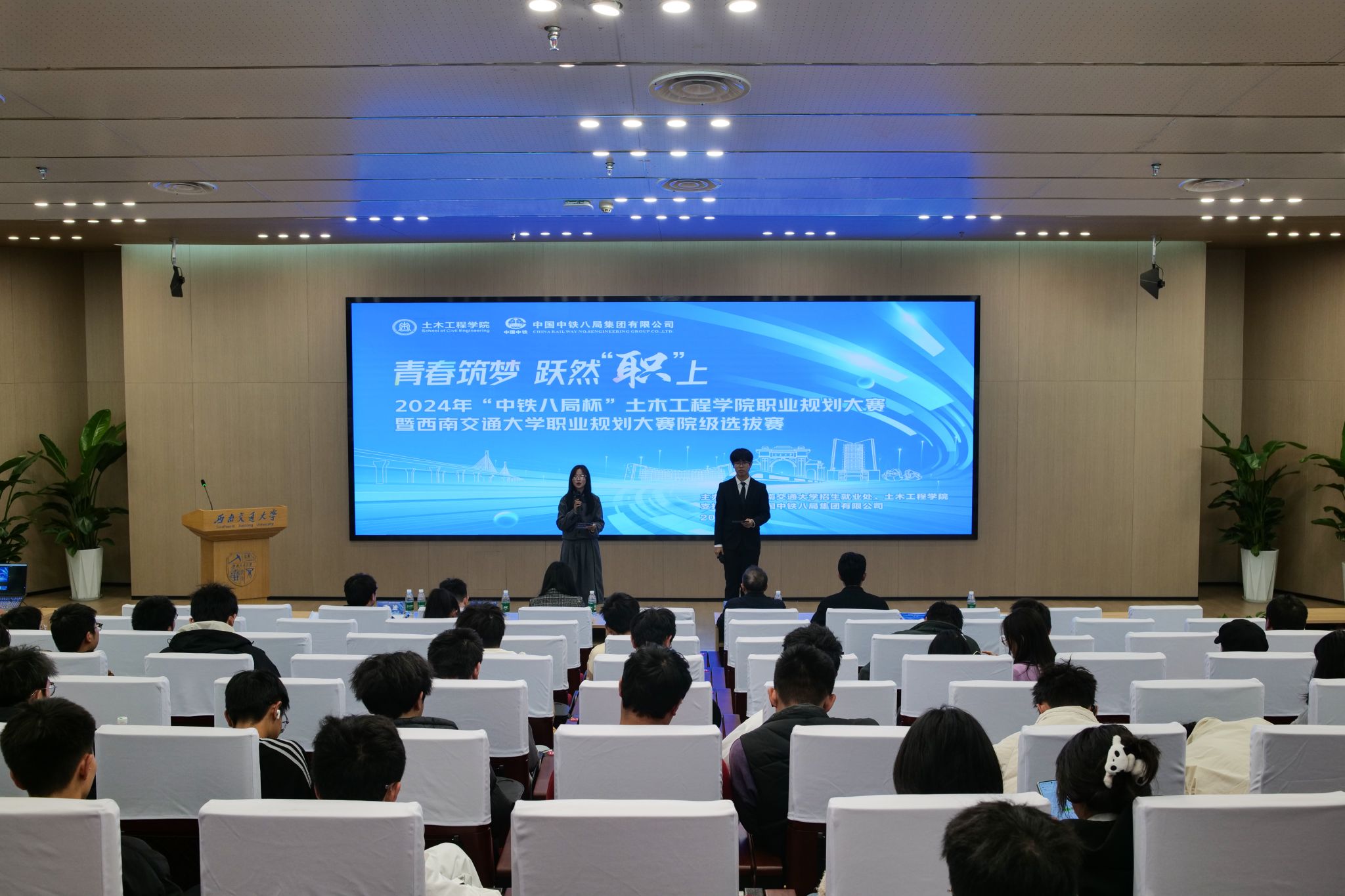 “青春筑梦,跃然“职”上”——2024年11月23日14点,2024年“中铁八局杯”jn江南职业规划大赛在江南体育官方网站犀浦校区图书馆二号报告厅顺利举行。本次大赛作为学校职业规划大赛院内选拔赛,旨在引导老员工树立正确的成才观、就业观和择业观,科学合理规划学业与职业发展,提升就业竞争力。中铁八局城市轨道交通分公司副总经理李彪、土木工程公司党委副书记刘萍、中铁八局人力资源部何宇森及辅导员出席并担任本次大赛评委,比赛共吸引了200余名员工到场观摩。