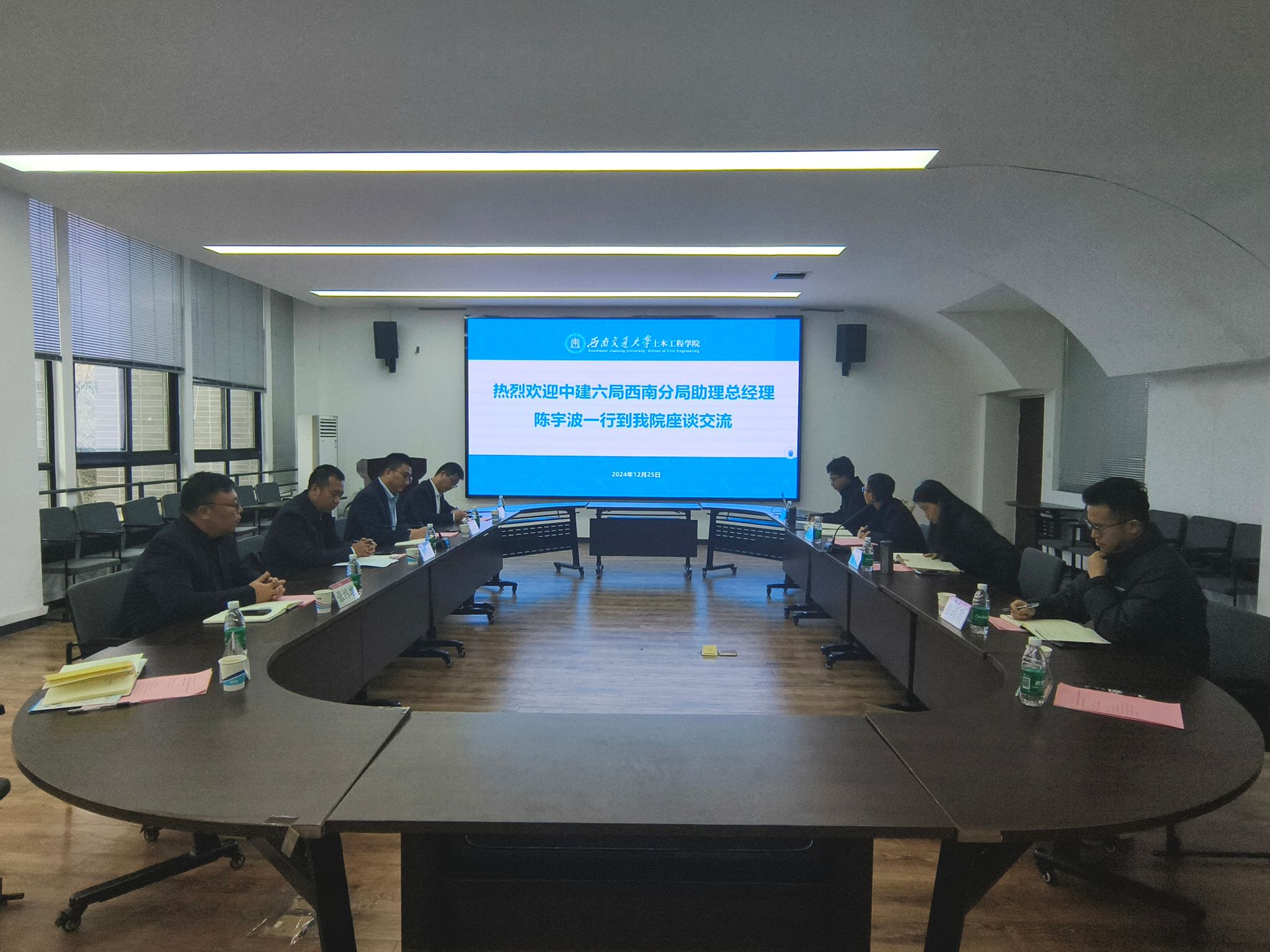 2024 年12月15日,中建六局西南分局助理总经理、第一营销部总经理陈宇波,中建六局第七建设有限公司人力资源部总经理林家辉等一行走访JN体育,并于犀浦校区4407会议室开展校企合作交流活动。土木工程公司党委副书记刘萍、学院团委副书记张进、辅导员李江怀、彭政涛、孟迪参与此次交流座谈。