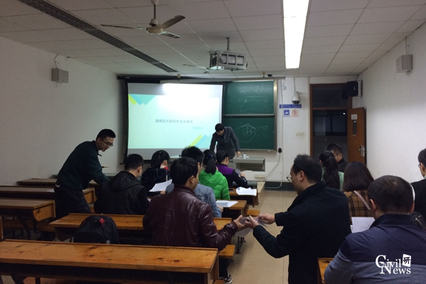 为维护学校正常的教学工作和管理工作秩序,增强研究生的安全责任意识,紧接着,史晓告知全班同学在读期间的安全责任,主要包括提供正确、详细的紧急联系方式;定期与导师、辅导员反馈个人学习、思想、生活情况;遵守学校住宿制度;注意外出安全;注意事故处理方式方法;自愿购买医疗和人身意外险等。