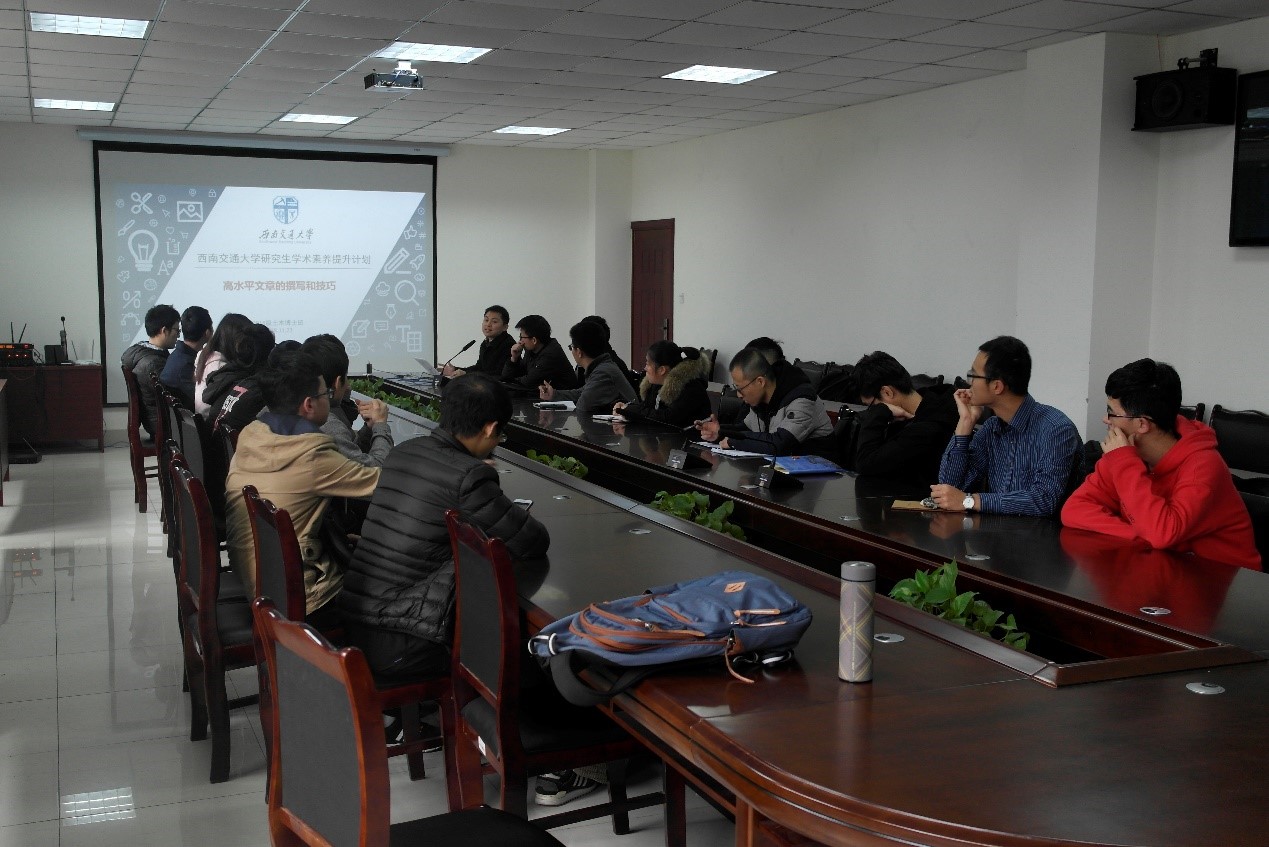 为全面贯彻落实全国高校思政会议和全国教育大会精神,融入教育现代化新征程,推进学校“双一流”建设,助推公司产品质量提升,抓实研究生学风建设,积极响应公司开展的研究生学术素养提升计划班级专项项目,2018年11月23日下午2点半,西南交大土木学院2018级博士班在九里校区交通隧道工程教育部重点实验室301举行了以“高水平文章的撰写和技巧”为主题的班级PADP活动。活动由班长周平同学主持。
