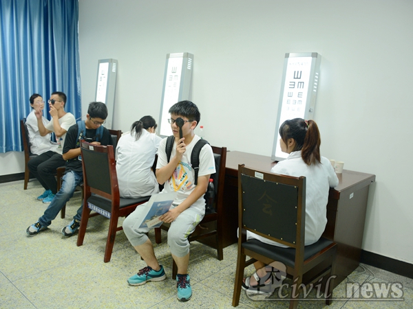 在志愿者和医务人员的指领下土木新生有序地进行各个体检项目。
