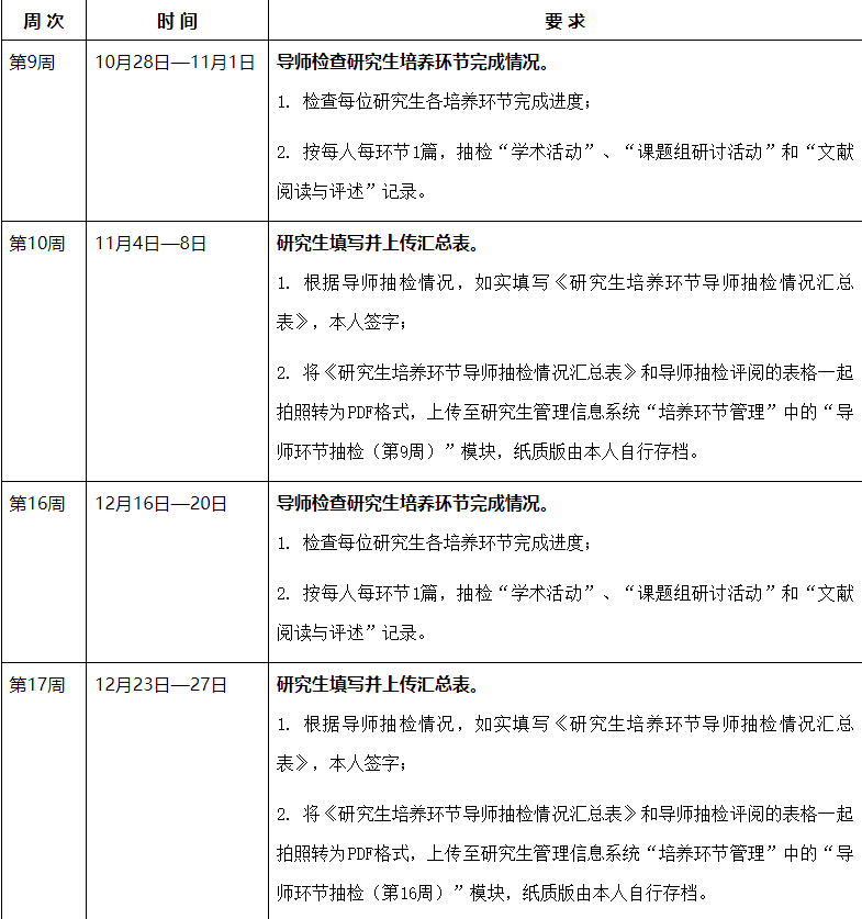 为了做好对公司产品过程管理的质量督导,保障公司产品过程质量,按照《江南体育官方网站公司产品过程管理与质量督导实施办法 》要求,每学期第 9 周和第 16 周为“导师抽检周”, 每学期第 11 周和第 18 周为“抽检归档周”。本学期抽检对象为2023级和2024级所有研究生(含职工),具体工作安排如下表,请各系室导师按照时间及要求进行培养环节的抽检和归档工作。