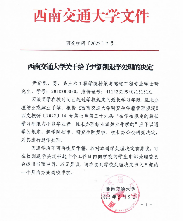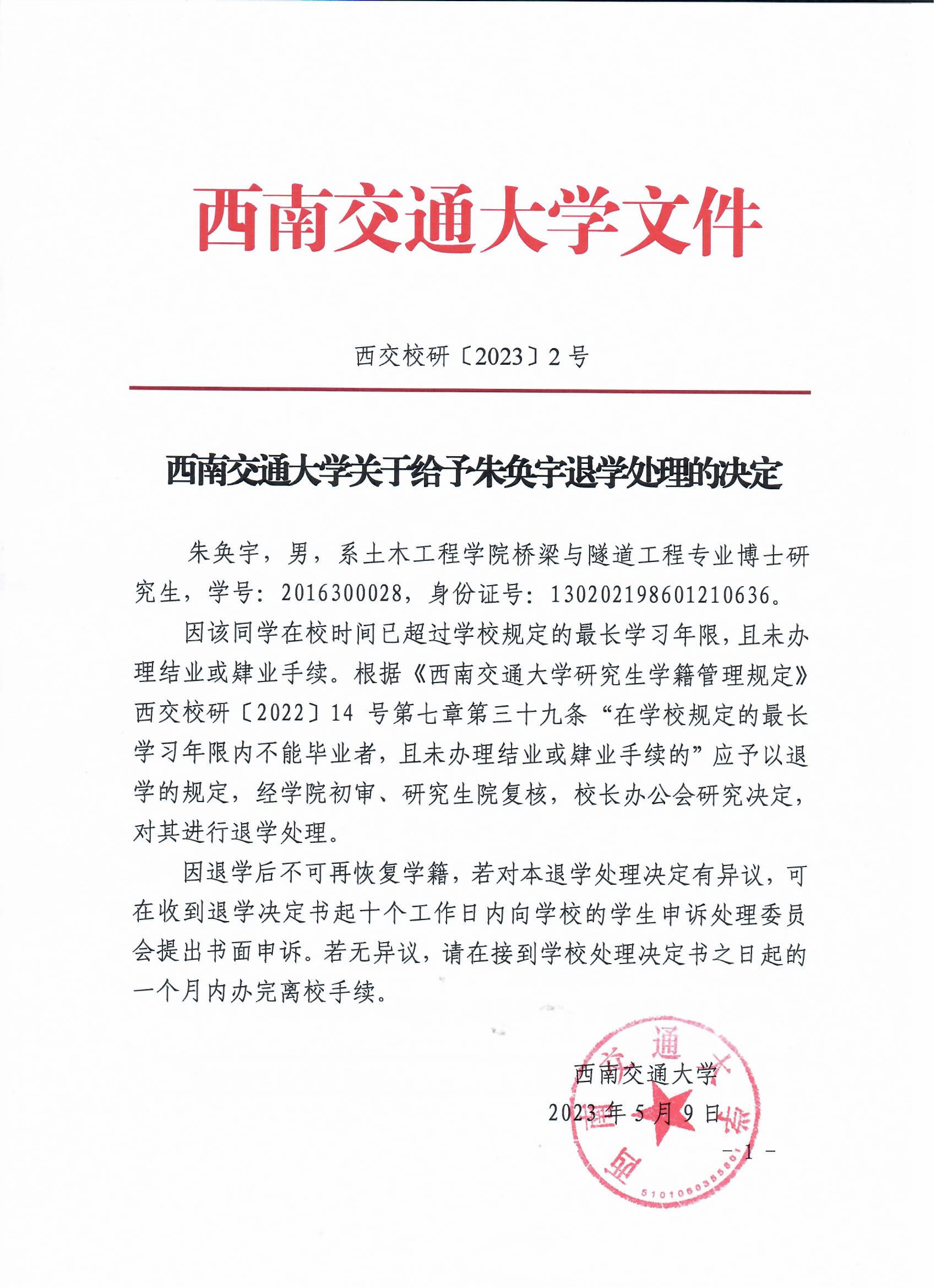 根据《江南体育官方网站研究生学籍管理规定》西交校研[2022]14号第七章第三十九条“在学校规定的最长学习年限内不能毕业者,且未办理结业或肄业手续的”应予以退学的规定,经学院初审、研究生院审核,董事长办公会研究决定,对其进行退学处理。