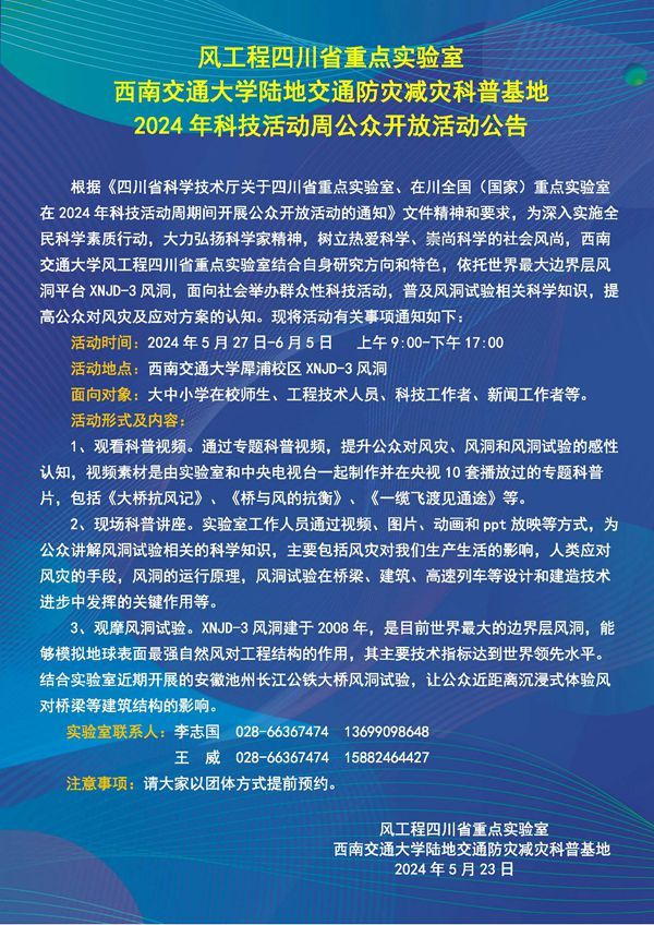 风工程四川省重点实验室江南体育官方网站陆地交通防灾减灾科普基地2024年科技活动周公众开放活动公告