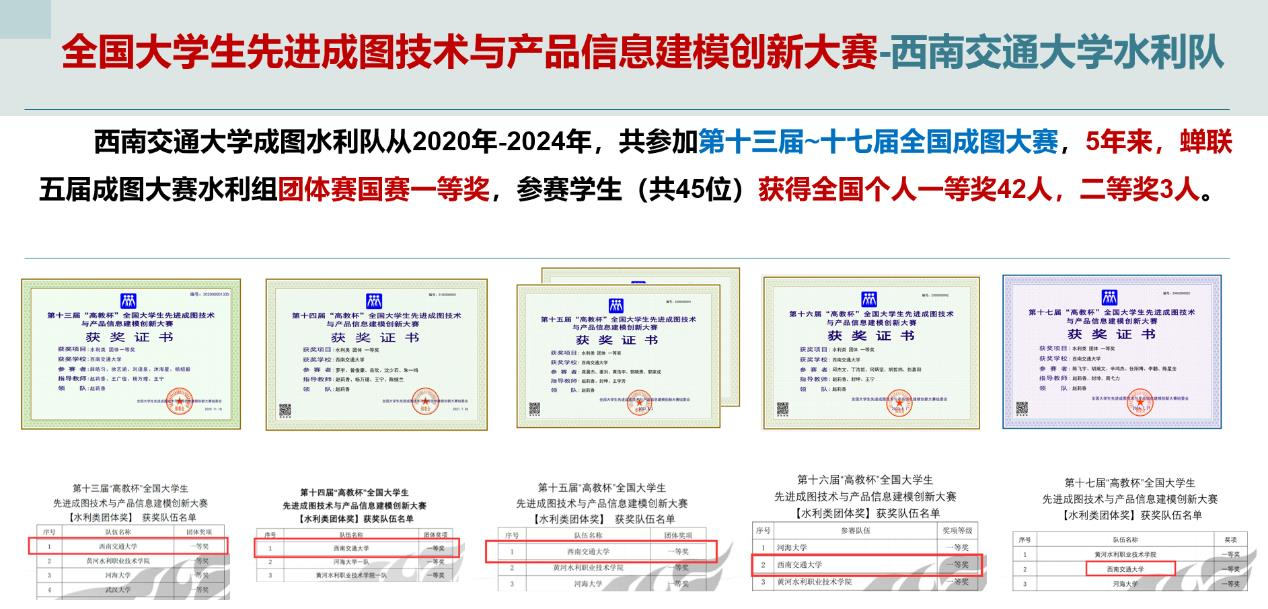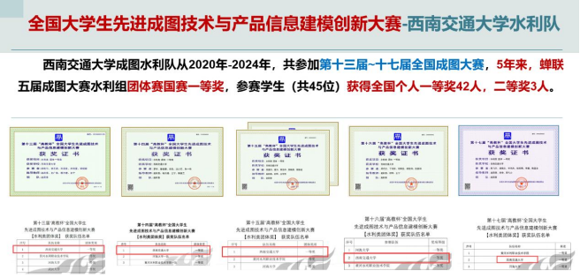 全国老员工先进成图技术与产品信息建模创新大赛是中国教育部及江南体育官方网站认证的A类学科竞赛。江南体育官方网站水利队连续参加了第十三至十七届先进成图大赛,成绩如下: