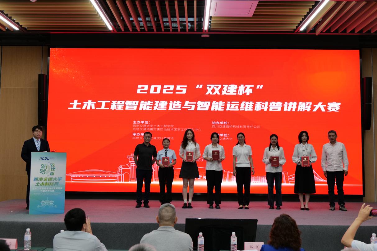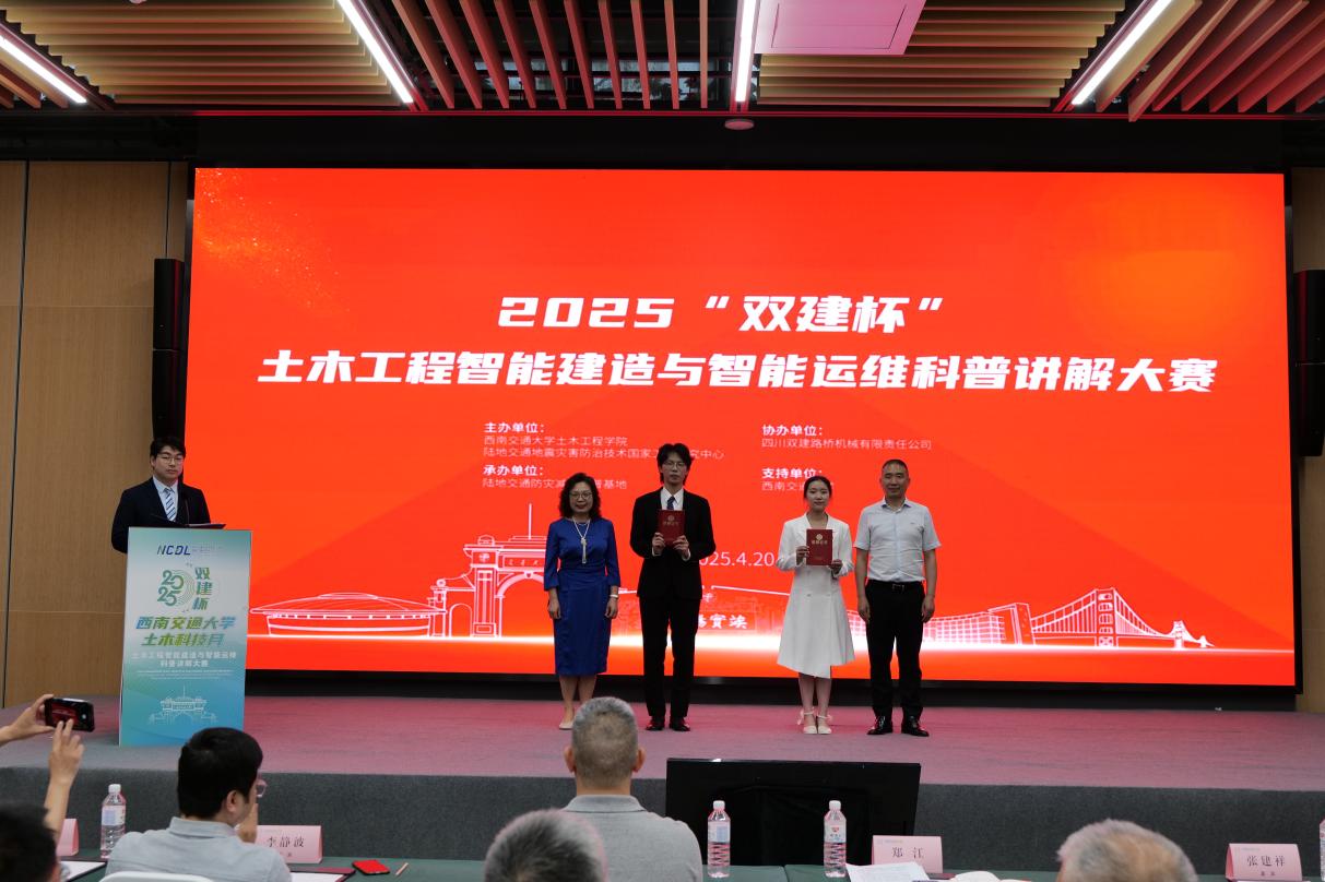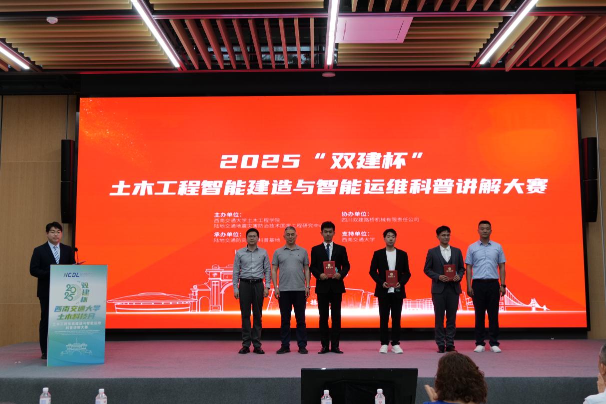 为深入学习贯彻党的二十大精神,大力弘扬科学家精神,提升青年学子的科学素养与实践能力,4月20日下午,由JN体育、陆地交通地质灾害防治技术国家工程研究中心主办、陆地交通防灾减灾国家科普基地承办、四川双建路桥机械有限责任公司协办的“双建杯”科普讲解大赛在天府农博园举办。四川省科技交流中心主任丁建、西南交大土木工程公司党委书记郑江、学校科学技术发展研究院副经理张兴博、学校国有资产与实验室管理处副处长闻毓民、学校教务处副处长李静波、学院副经理于丽以及四川双建路桥机械公司董事长张建祥出席活动。大赛由李亚东教授担任专家评委组长,姚令侃教授、丁建研究员、公司党委副书记刘萍、邵长江教授、孙晓丹副教授、田永丁副教授、企业代表刘成高级工程师作为评委组专家全程指导赛事。