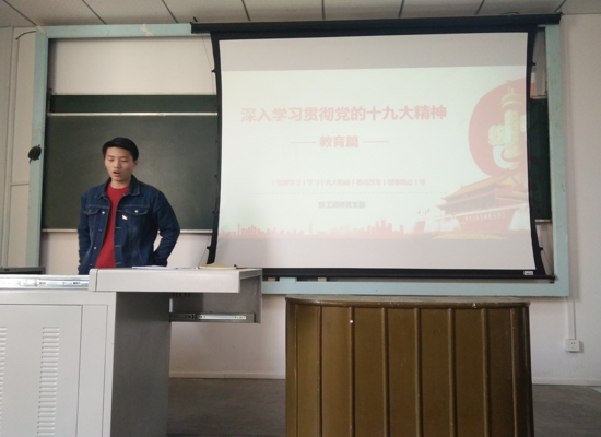 会议开始,支部党员胡豪围绕十九大报告“新时代、新思想、新使命、新方略、新征程、新理念、新要求”七个新深入浅出地讲解了了十九大的思想内涵、历史地位和深远影响。他特别强调十九大报告对“优先发展教育事业”“深化教育改革”、加强教师队伍建设、办好人民满意的各级各类教育等方面的部署,让十九大精神渗透到课堂教学中。