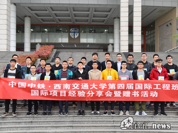 4月2日下午三点, 中国中铁国际工程班国际项目经验分享会暨赠书活动在犀浦校区X9303举行。出席本次活动的领导有:中铁二局国际部商务合同科科长胡伟,中铁亚欧阿斯塔纳轻轨指挥部办公室主任幸代泗,中铁二局人力资源部唐梓淇,中铁二局人力资源部祝军以及中国中铁第四届国际工程人才班的部分学员。jn江南辅导员任福老师担任本次活动的主持人。