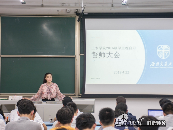 4月22日晚上七点半,土木学院2016级员工晚自习誓师大会在犀浦校区X2424教室举行。到场的有16级的四位辅导员老师:付真珍老师、吴文芊老师、李裕老师与向京华老师,以及16级22个班级的班长和学业提高班的同学。