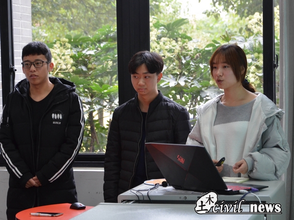 还有一支由2015级土木10班竢实扬华奖章获得者顾天宇带领的队伍也上台展示了他们的能力。他们从团队成员到工作分配,再到构想都表现出与众不同的风格。另外,还有一队由2015级土木1班的张檬丹,周凯歌,王祥组成,他们三个在展示时胸有成竹,自信的背后是一个又一个来之不易的荣誉。他们在各种比赛中的表现都令人惊艳,强强联合组成一支强大的团队。他们从参赛基础到创新设计都表现出了自己的能力。三人不仅分工明确,实力更是不容小觑。