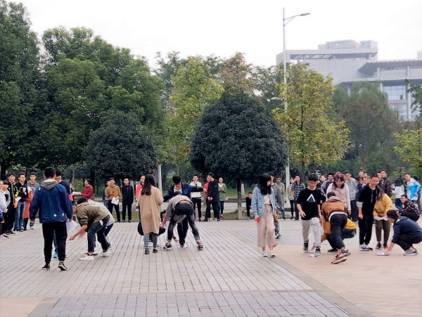 第一个正式游戏的名字叫做“搭桥过河”,首先每个队中选出三名队员参加这个游戏(一人负责“过河”,一人负责“搭桥”,另外一人负责“收桥”),利用发放的三张A4纸,快速从起点到达终点。如若途中“过河”的人脚触地,每次加2秒,按照最终时长排名。游戏过程中,各个队都不甘示弱,参与游戏的队员拼尽全力,其余队员也给自己的队伍加油鼓劲,现场氛围一度高涨。第一个游戏过后,大家似乎明白了游戏的诀窍,也明白了合作的重要性。