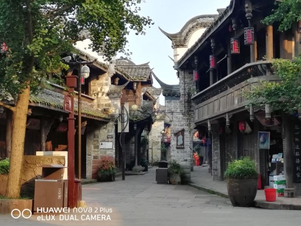 第二天的早上8点,我们再次进入黄龙溪古镇,趁着早晨人还算少,我们对众多地方进行了勘察和拍照。黄龙溪古镇现存多为明清时期的建筑,主街道由石板铺就,两旁是飞檐翘角杆栏式吊脚楼。一些建筑内被改成商铺,而在月牙街的大部分建筑仍未改成商铺,依然作为家宅。其中的一些商铺在晚上关门时甚至不用门,而是用与门面高度一致的几块厚板锁门。实在是一种古朴的方式。