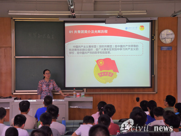 9月1日开始,为提高新生对学院里团学组织的了解和对共青团员的认识,增加其自豪感并充分调动其积极性,土木学院为18级新生开展了团学教育讲座。黄雪娇、王若羽、李裕老师担任主讲人。9月1日下午三点半,记者走进X4151教室,与新同学们一起参加了黄雪娇老师的一节团学教育讲座。