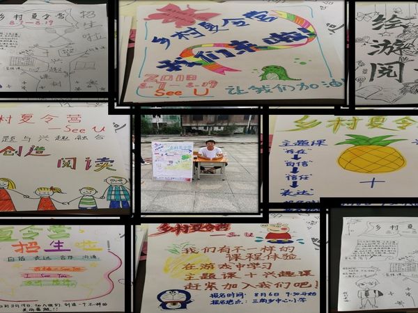 到达学校后,我们和当地的团委书记进行了对接,在明确了住宿和做饭以及教学的地方之后就开始为招生做准备了。8月5号上午我们开始制作招生海报,下午我们在小镇上上去挨家挨户宣传,后面还让当地村委的书记通过高音喇叭帮我们宣传,以下就是我们的招生海报和宣传摊。
