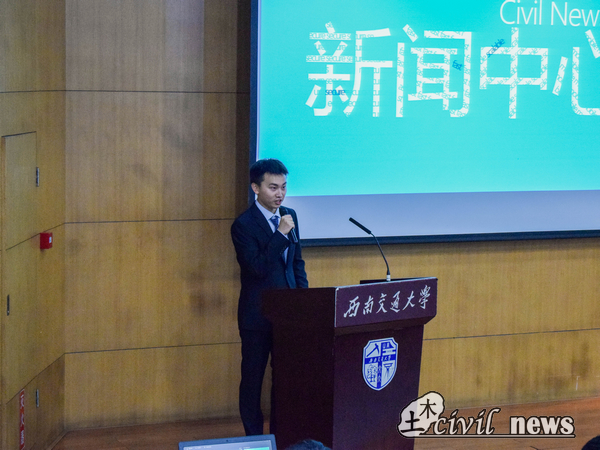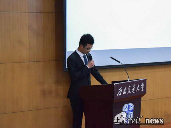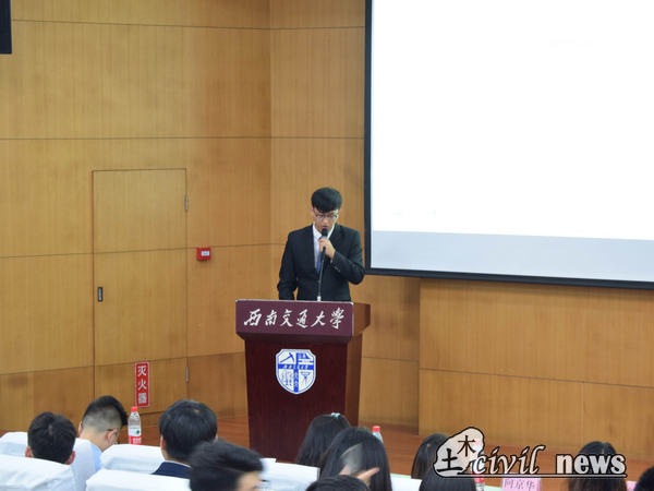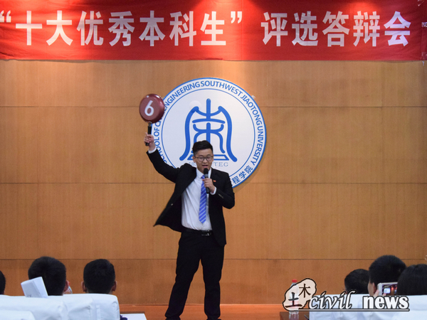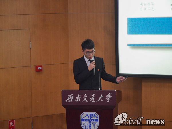 由主持人介绍了评选规则之后,第一位上场的答辩选手是新闻中心主任、土木员工会副主席顾天宇。他曾获特等奖学金、唐立新奖学金等各项奖学金六次,四川省老员工结构竞赛一等奖、美国混凝土轻舟赛赛区第六。他的答辩别出新意,将自己比作性能齐全的一台手机,激情洋溢的演说点燃了现场的氛围。