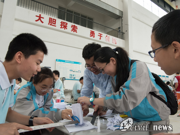 之后,同学们来到土木教学示范中心参观,并进行模型制作。在基本了解赛题后,科创中心的志愿者们组织同学们分组,并进行30分钟的模型制作、承重与加载。此次制作主要是模拟地震波对建筑的影响,考验大家的动手能力。在比赛过程中,同学们用他们的奇思妙想,制作出稳定的模型来陈放鸡蛋。大部分小组的模型经受住了仪器的考验,并成功加载。结束后,志愿者为加载成功的小组颁发奖品,纪念此次活动。