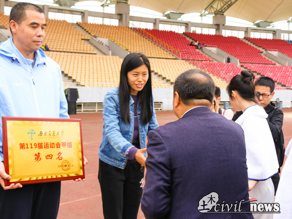 首先,由总裁判长李宏图宣布运动会的比赛成绩,土木学院以258分位列甲组第四名,以16分位列甲组员工体质四项团体总分第四名,由沈火明教授为同学们颁奖。接下来,由校工会主席阎开印教授宣布教工比赛成绩,土木学院以136分获得教工甲组第六名,由阎开印教授颁奖。