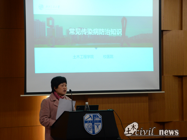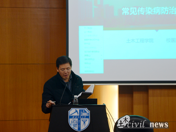 11月27日下午4点,犀浦校区图书馆二号报告厅举行了《传染病的防控》主题讲座,讲座的主讲人是犀浦校区校医院的唐医生。土木工程公司党委副书记李锦红、副教授蒋雅君与学院各级辅导员共同出席了这次讲座。