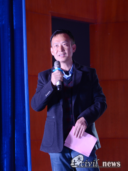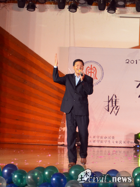 随着晚会的开始,蒲黔辉经理上台致辞,他表示,年轻人们遇到了好时代,当今处处都是机遇。另外他对在座的土木学子们提出两点希望,一是希望土木学院的新鲜血液们能够在突变的学习环境中学会坚持,明白通往成功的路上没有捷径;二是希望员工们在复杂的网络环境中有自己的立场和思考,用平常心看待社会问题。最后,他对本次晚会表示了自己衷心的喜爱与希望。
