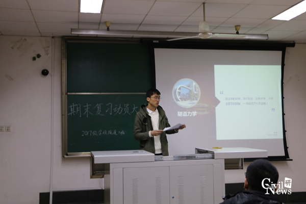 12月2日晚上七点三十分,2017级学硕隧道1班在逸夫馆4419召开“期末复习动员”主题班会,班会由该班班长李策主持,该班全体同学参加本次班会。