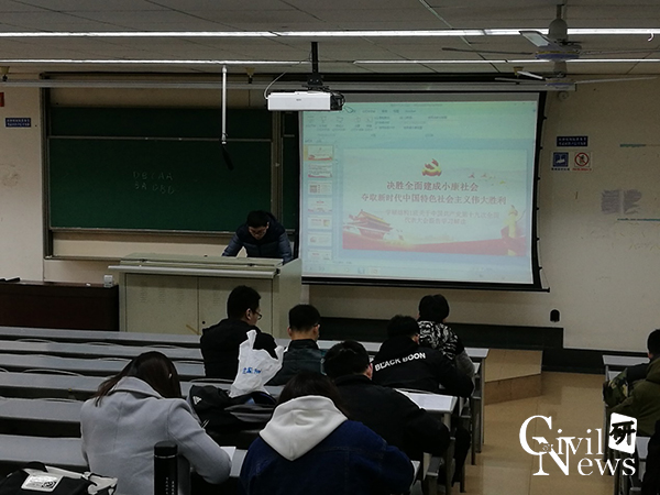 胡文豪同志首先就十九大报告的重要意义与地位向在座的同学进行了简单的介绍。接着,党支书朱文凯同志带领大家学习十九大的报告。十九大报告主题为不忘初心,牢记使命,高举中国特色社会主义伟大旗帜,决胜全面建成小康社会,夺取新时代中国特色社会主义伟大胜利,为实现中华民族伟大复兴的中国梦不懈奋斗。报告的主题鲜明、思想深邃、高屋建瓴、博大精深,高举中国特色社会主义伟大旗帜,提出了习近平新时代中国特色社会主义思想和基本方略、战略安排,是一个中国特色社会主义理论和实践创新成果集大成的报告,是一个党和国家发展史上划时代的报告,是一个凝聚全党智慧、顺应人民期待、对我国发展具有重大指导作用的报告。在座的同学都认真倾听。