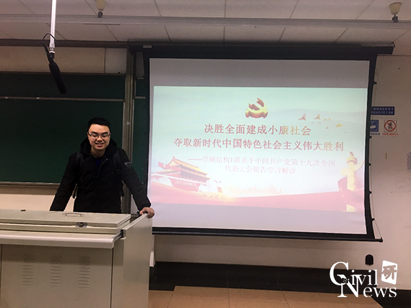 12月14日下午一点,2017级学硕结构一班在逸夫馆4323举办了“十九大知识竞赛”的党支部活动。2017级学硕结构一班全体同学参加了此次活动,班长胡文豪与党支书朱文凯组织本次活动。