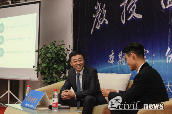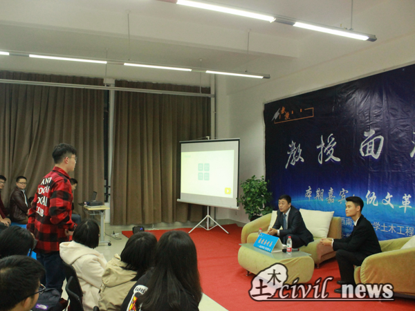 随后,主持人就从仇教授的研究生员工们处得来的信息,向仇教授询问了他对待自己科研工作的方法,仇教授用“用双脚做研究”一表自己对实践的看重。谈及对“女生学土木专业不被看好”的看法时,仇教授告诉同学们:“土木是一门需要吃苦的专业,只要吃的下苦,女生也可以学好土木。”当主持人问到同学们最关注的仇教授对员工的要求时,仇教授表示除了成绩外,他的员工还需要吃得下苦,具有团体精神,最重要的是,需要有创新意识,对此,仇教授还特地举了钱学森先生的例子,并强调这是现在的中国科研工作者非常需要的品质。最后,主持人向仇教授提出了最后一个问题:“如今的土木工程专业怎样才能跟上时代的发展?”仇教授用简短的一句话概括其答案——加深人类对自然的认识!