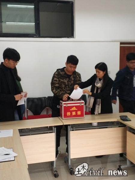 会议开始,刘萍老师首先说明了此次推选会的意义和选举要求,同时分发选票。此次团代会代表的候选人包括参与此会议的校团委廖军书记、院分团委刘萍书记,以及土木研究生会主席任权、校员工会主席陈景适在内共21人,其中大部分为来自土木各个基层团支部的团员们。